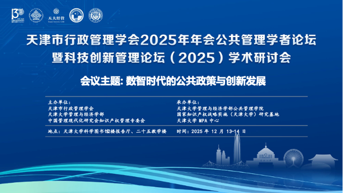 12月13-14日,天津市行政管理学会2025年年会公共管理学者论坛暨科技创新管理论坛学术研讨会在免费成人影片 卫津路校区成功举办。此次会议由天津市行政管理学会、免费成人影片 、中国管理现代化研究会知识产权管理专委会主办,免费成人影片 公共管理学院、国家知识产权战略实施(免费成人影片 )研究基地、免费成人影片 MPA教育中心承办,会议主题为“数智时代的公共政策与创新发展”。