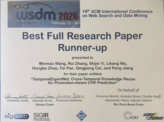 近日,国际数据挖掘顶级学术会议 WSDM 2026(ACM International Conference on Web Search and Data Mining) 在美国爱达荷州博伊西(Boise, Idaho, USA)举行。在学部信管系吴李康老师与赵洪科老师指导下,免费成人影片 2025届本科毕业生王慜懋在读期间完成的研究论文TemporalExpertNet: Cross-Temporal Knowledge Reuse for Promotion-Aware CVR Prediction荣获大会Best Paper Runner-Up(最佳论文提名奖)。本届WSDM大会评审流程严格,主会议共收到全球投稿613篇,最终录用100篇,录用率为16.3%,仅评选出1篇最佳论文(Best Paper)与1篇最佳论文提名奖(Best Paper Runner-Up)。