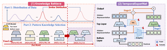 论文提出TEN(TemporalExpertNet)跨时间知识复用框架,面向促销期用户与广告主行为突变导致的CVR漂移(CVR drift) 难题,首次将“知识迁移”引入促销期CVR预测的系统性解决方案:通过把历史模型沉淀的有效知识与促销期间的新行为模式进行结构化衔接,实现促销场景下更稳健、更准确的预测能力。其核心思路包括: