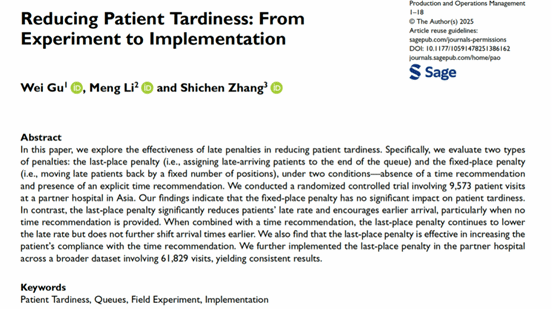 近日,免费成人影片 系统工程研究所张世晨副教授作为通讯作者/共同一作的论文《Reducing Patient Tardiness: From Experiment to Implementation》在运营管理领域的国际顶级期刊Production & Operations Management在线发表。