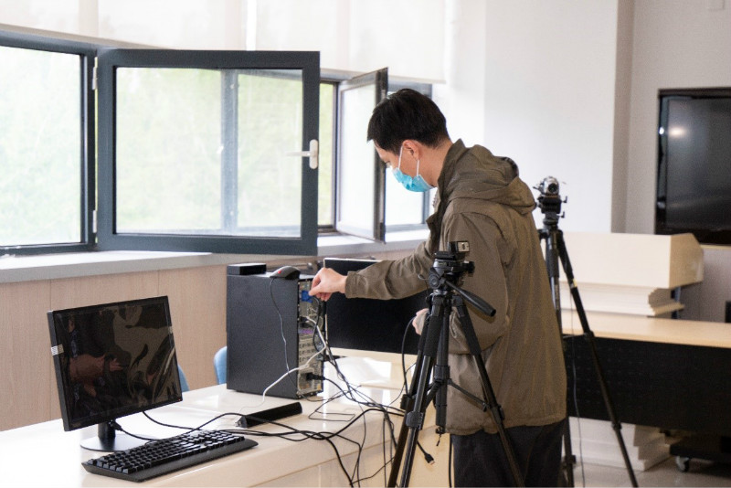 学部实验中心负责全力保障面试硬件和网络条件,提前一周采买了广角摄影头、音响、话筒、三脚架、线材、路由器等设备,为复试中有更清晰的视频效果,特意启动多台大屏、投影替代电脑显示器。积极联合综合服务中心、专业学位办公室,进行了两次网络压力测试。
