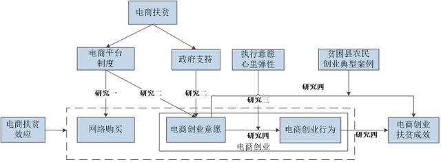 电商平台制度创新进一步加强了电商扶贫的作用效果,释放了中国农村农民的网络购买力,使城乡居民享受到同等的购物实惠。然而,贫困地区的许多农民对电商平台提供的技术和服务了解有限,创业意愿较低,且并不是所有的都会转化为创业行为。在电商扶贫背景下,贫困县农民对电商创业过程不明晰。这些问题都是政府和学者们关注的热点。