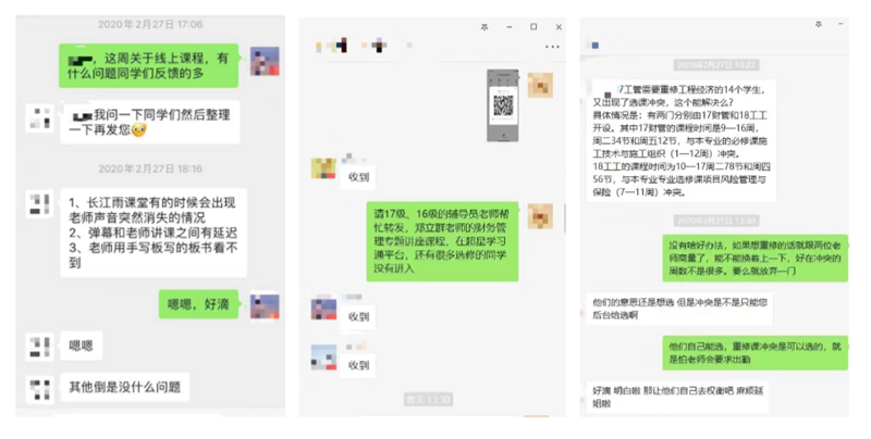 针对以上情况,学部加强了“教务员+辅导员”协作工作机制,建立了由主管本科教学的副主任、主管学生工作的副书记,以及教务员和辅导员在内的学部本科工作组的微信群,对授课期间的各种信息和问题发布在群中,第一时间让主管领导知晓,问题第一时间得到处理方案。