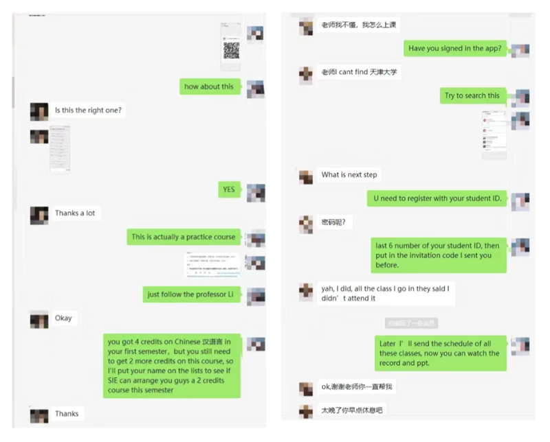 留学生是一个特殊群体,学部目前有51位留学生,分布在13个国家,这些国家和中国有1-13小时的时差。他们大多数中文能力有限,面对突然出现的多个学习平台操作说明和众多的课程要求信息,显得力不从心,教务员坚持与留学生加强沟通,提供一对一服务,帮助他们进入课堂、加入课程微信群,完成51名留学生共计104门课程的选课和报备。