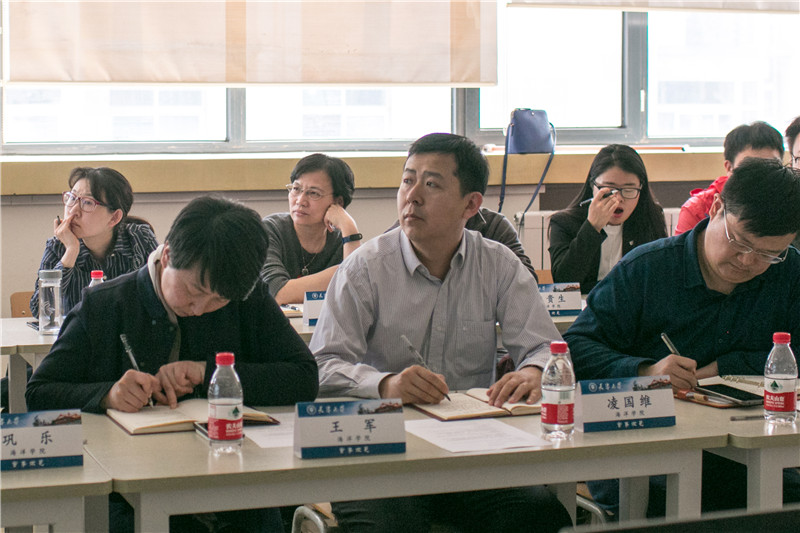 靳楠介绍了海洋学院教工党支部的建设情况,包括支部的政治建设,组织建设,党员教育管理等方面。他指出,学院专业教师党支部和行政党支部都是有战斗力,有活力,年轻化的队伍;党员老师们在学院基础设施建设、人才培养、科学研究、管理服务等各项工作中都发挥着中流砥柱的的作用。