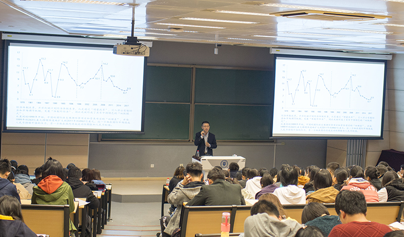 简短的启动仪式营造了极佳的分享氛围,刘大勇老师在大家的期待中开始他的讲座。他以“改革开放四十年与中国产业的成长方式及转型发展”为主题,着重分析了过去四十年间中国经济发生的巨大变化,分析了产业成长的驱动力与市场、制度共同作用的内在机制。他引用了与自己的老师段文斌教授合作的研究观点,指出1978年开启的经济体制改革并非打破计划经济体制本身,而是通过“增量改革”引入非公有制经济和市场调节机制,发展“体制外经济”,从而形成具有中国特色的“双轨模式”,中国过去四十年的增长在整体上体现为依靠要素组合优势承接了国际产业转移。