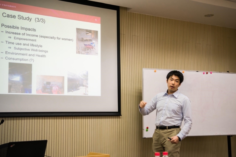 Wataru Nozawa助理教授在会上做了题为“董事会构成,公司环保策略和财务绩效”的报告。报告内容主要围绕两个基本问题展开:一是“什么样的公司在环保策略方面更为严格?”;二是“公司的环保策略会损害财务绩效吗?”。为了回答上述问题,Nozawa利用彭博社收集的全球5712家公司数据展开实证分析。首先,他跟据董事会构成状况,对公司进行了基本分类;其次,利用收集到的财务数据测算了各公司的财务绩效水平;最后,依据公司环保策略的披露与执行情况,对环保策略也进行了分类。在此基础上,利用潜在类别分析法,考察各类别变量之间的相互关系。该研究为公司完善董事会结构,选择适当的环保策略,进而增强财务绩效提供了一定的启示。