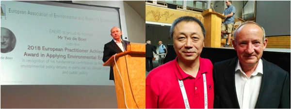 上午欧洲环境和资源经济学家学会终身成就奖(政策实践)得主、欧盟委员会气候司Delbeke司长在张中祥教授组织的政策分会上发言后,原联合国气候变化公约秘书处执行秘书Yvo de Boer被授予终身成就奖(政策实践)。当年Yvo在荷兰政府任司长时,支持了90年代在荷兰瓦赫宁根大学和格罗宁根大学任职的张中祥教授8年的研究工作以及张中祥教授任职美国东西方中心时组织的活动。感谢当年的博士生、现任荷兰Tilburg大学经济系教授的Daan van Soest帮拍了张合影。