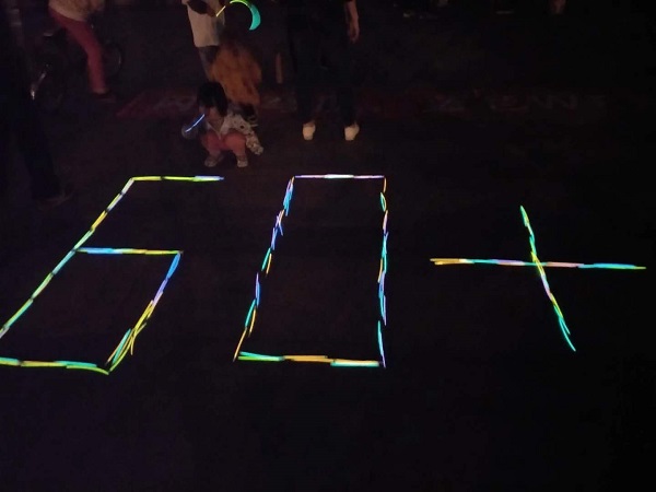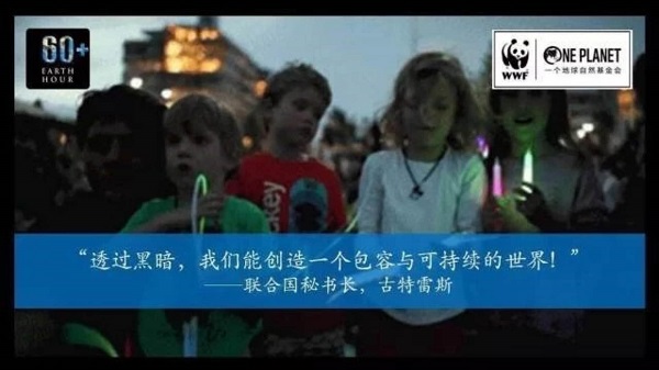 夜色下的北洋广场,白色的T恤闪耀着五彩的光芒,表达着参与者们对环保的希冀。众人一同努力,在北洋广场上拼凑出由荧光棒组成的“60+”图案,助力低碳生活,在黑暗中传递光明。