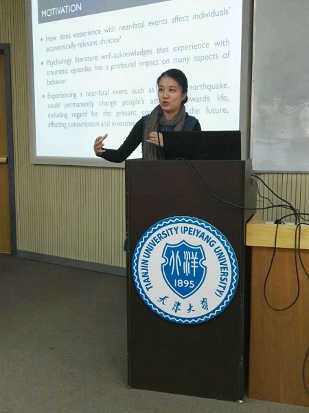 香港中文大学商学院助理教授连暐虹博士呈现了题为“大型地震与现期偏向型消费结构”的报告。心理学理论表明,创伤性事件的经历会对人的行为产生深远影响。经济学文献表明大事件或致命事件可能会改变个体的消费、投资等决策。连教授和合作者结合两个学科,建立消费者两阶段模型,采取差分回归的手段,对经历与未经历大型地震的人群的消费偏好从风险偏好和时间偏好两方面进行了行为经济学方向的研究。连教授团队还对地震事件的事前内生性进行了稳健性检验,并控制事后影响因素。研究根据世界重大地震数据库数据,选取地震前后的不同时间窗口,分析经历了大型地震的人群相比于未经历大型地震的人群在消费行为上的差异性。连教授通过图表展示了地震经历对个体各项支出占比情况的影响,其主要差异体现在“面向当下的享受”或是“面向未来的投资”的支出方面。其研究结果发现,两类人在储蓄率上没有显著区别,但亲身经历过大型地震的人群会比未亲身经历过大型地震的人群更加地“当下导向”而非“未来导向”,亲历过大型地震的人在教育上的支出相比也更少,但在娱乐、饮品、炫耀性消费、健康和便利性消费上的支出会更多。连教授与合作者还对研究结果进行了证伪检验。在未来可以研究的方向上,连教授指出,可以对交互作用,如距离和震级等,进行进一步的研究,并希望这项研究可以对各类重大事件如何影响个体信仰和偏好这一问题的回答作出贡献。