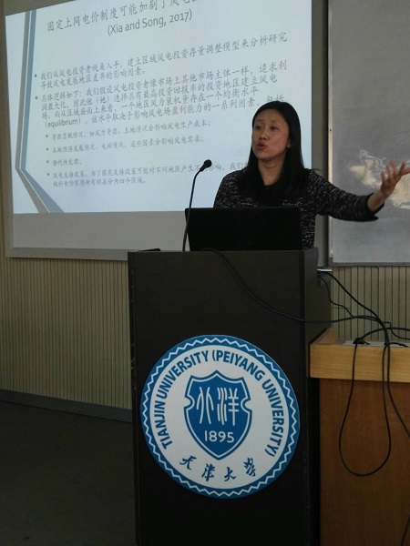 中国人民大学经济学院宋枫副教授分享了她关于产能过剩、补贴制度与弃风现象的研究成果。近几年我国风电行业发展迅猛但浪费严重,出现了“边建边弃”的怪圈。宋教授和合作者的研究主要探寻我国高弃风率背后的原因,尤其是风电支持政策起到的作用。他们从风电投资者视角入手,建立两期风能投资模型。假设市场存在多个同质企业同时进行建立风电场的计划,第一期为建设即选择装机量,第二期生产获得收益,在考虑投资、成本和企业数量等因素求利润最大化的条件下,得到模型均衡解。模型计算出行业发生产能过剩的概率与装机成本和上网电价有关,补贴过高会加剧产能过剩。选取2009-2015年省级数据对模型进行初步检验,宋教授和合作者的研究结果显示,每多补贴0.1元,弃风率增加约13%。因此可见,政府支持使得风电大规模发展,且近年装机成本持续下降,补贴价格却没有及时随之调整,加剧行业产能过剩。基于此,宋教授指出支持可再生能源发展需要更多的市场化手段提高效率,纳入正在进行的电力市场改革打破全额保障性收购,备选方案包括特许权招标和可交易配额等。